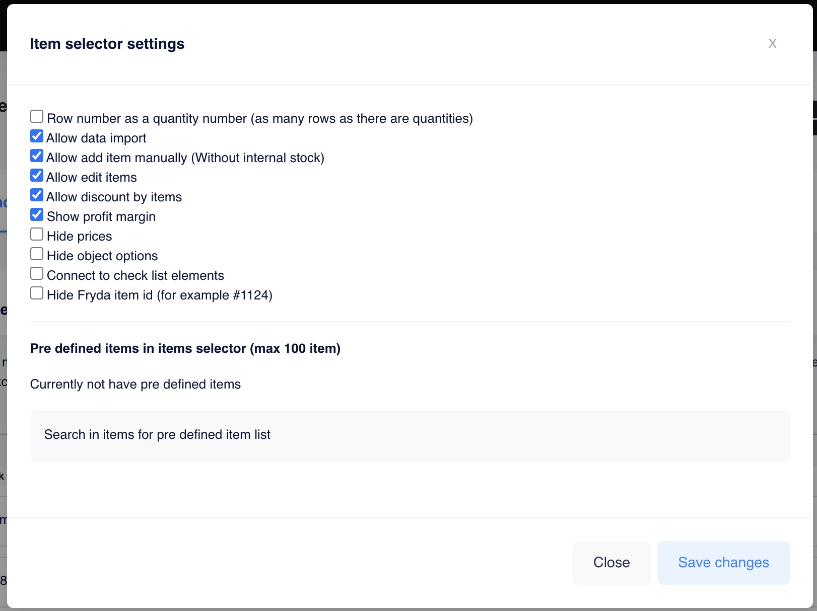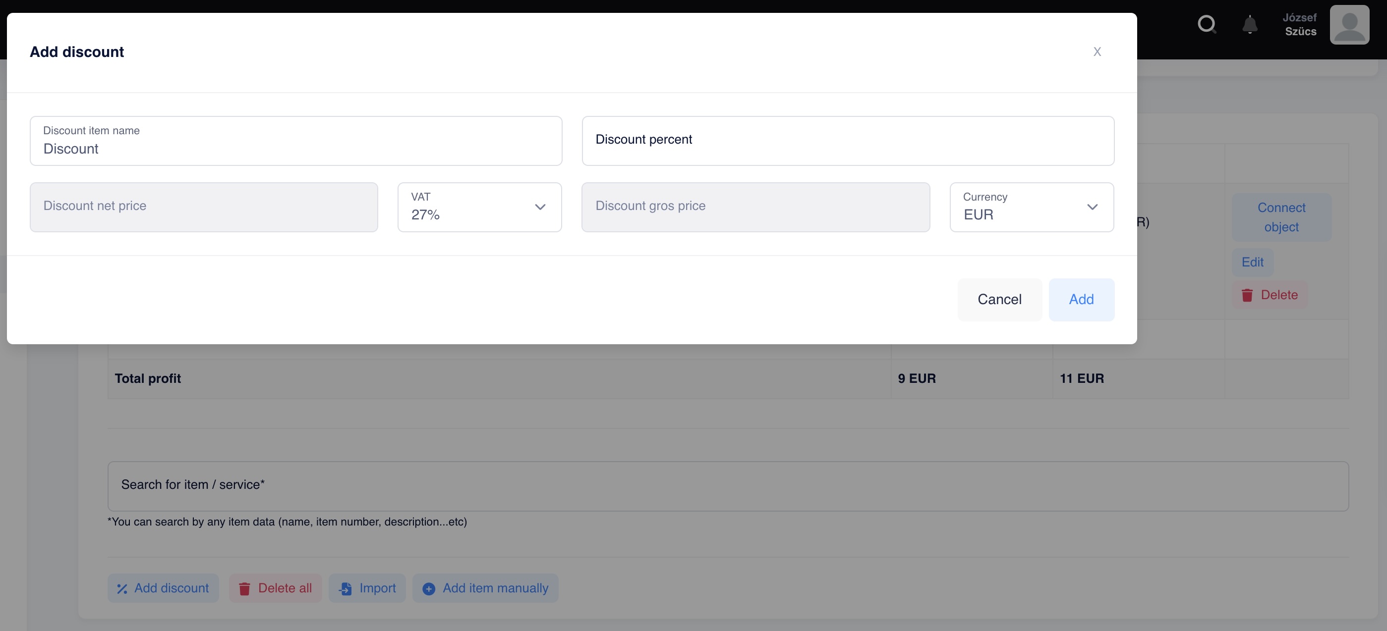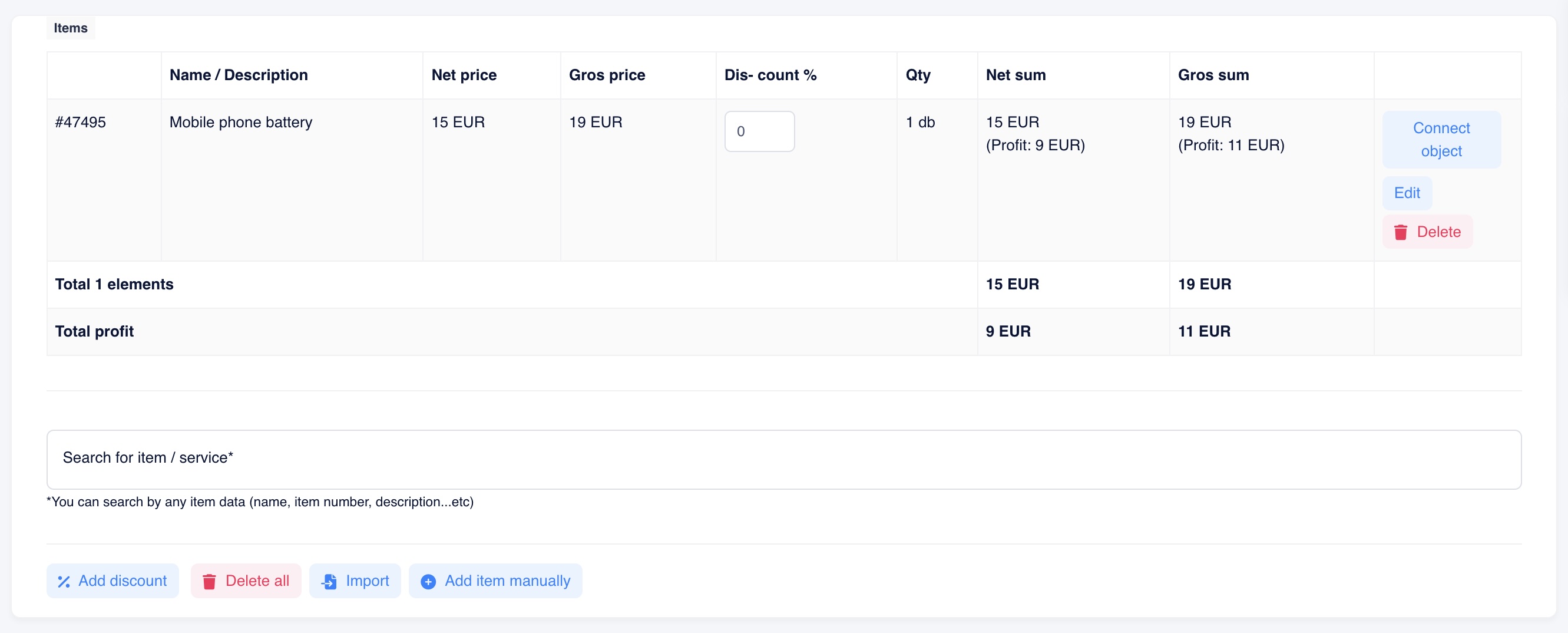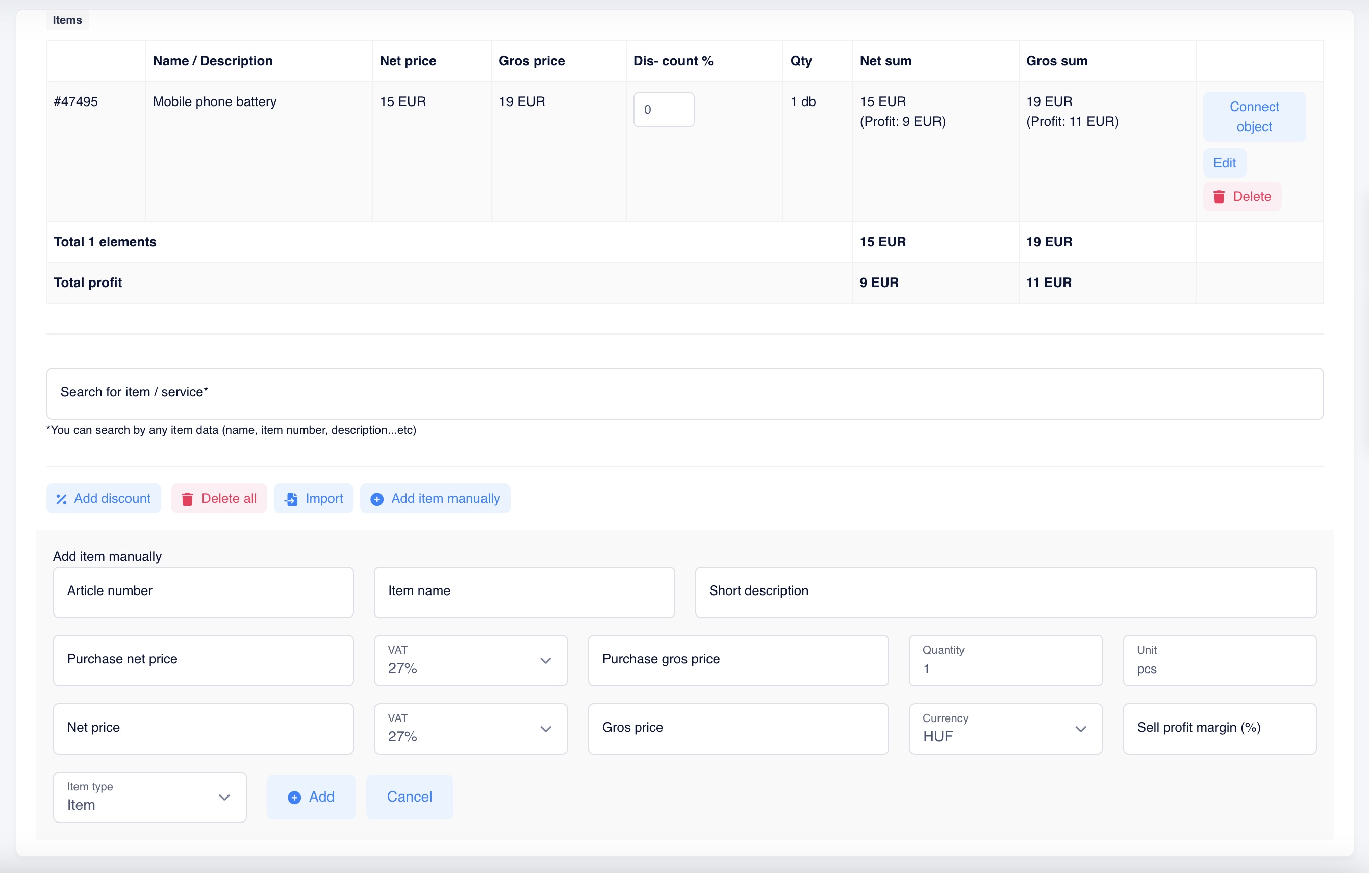 You can also enable options such as hiding prices, displaying profit margins, allowing later editing of products, specifying discounts per product (a discount for all products at once is also available), and pairing products with an object.